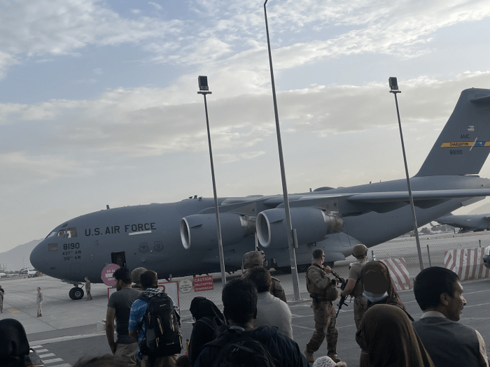 We could not get to the airport yet because it was a mess, but we had to move to a different location because the Taliban was looking for me by name. My American colleague gave me the name of a U.S. servicemember who was at the airport and would help me and my family. I sent him pictures of my family so we could be easily identified. When we finally arrived at the airport, there were thousands of people already there. A wave of people pulling and pushing. My kids were crying, my wife was eight months pregnant, and it was extremely hot. I decided to go back home and leave my kids with my parents and give myself up to the Taliban. On the way back, we stopped at a restaurant to clean up so my family would not see us so disheveled. That is when my colleague called me and begged me to go back to the airport and said that he would find a way to get us on a plane, so we went.